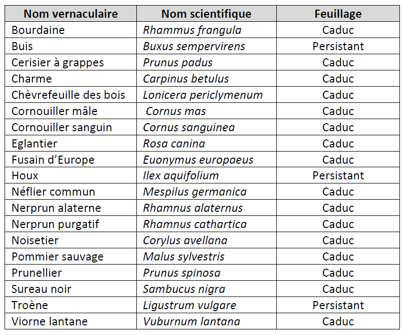 Les espèces pourront être choisies parmi les espèces suivantes avec, au minimum, une diversité comprenant de 6 à 12 espèces différentes à choisir parmi les essences disponibles au moment de l’achat (la demande est actuellement très forte en Végétal Local et les achats doivent être anticipés autant que possible afin de pouvoir bénéficier d’essences diversifiées) :