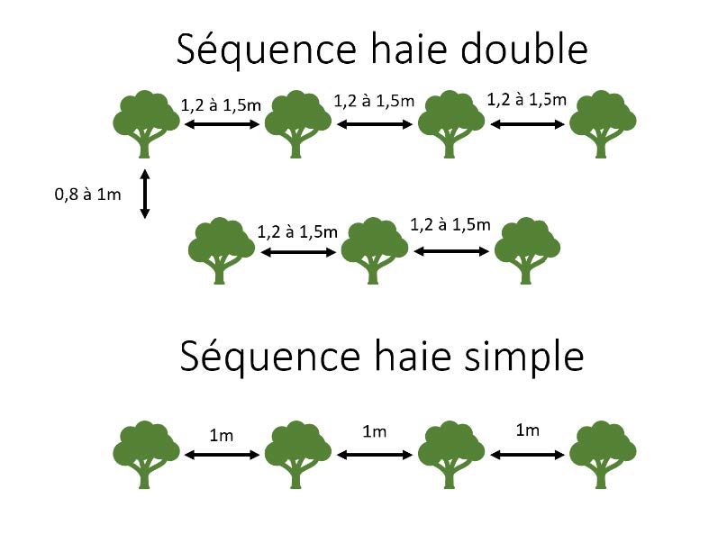 Nous préconisons l’installation de haies champêtres sous forme de haies doubles, nettement plus favorables pour l’accueil de la faune, mais nécessitant une emprise au sol plus grande. Planter sur 2 bandes permet d’avoir un secteur intercalaire en herbe qui servira de refuge et constituera un corridor plus efficace pour la faune. À défaut, notamment si l’espace disponible s’avère insuffisant, une haie simple mais assez dense pourra être envisagée.